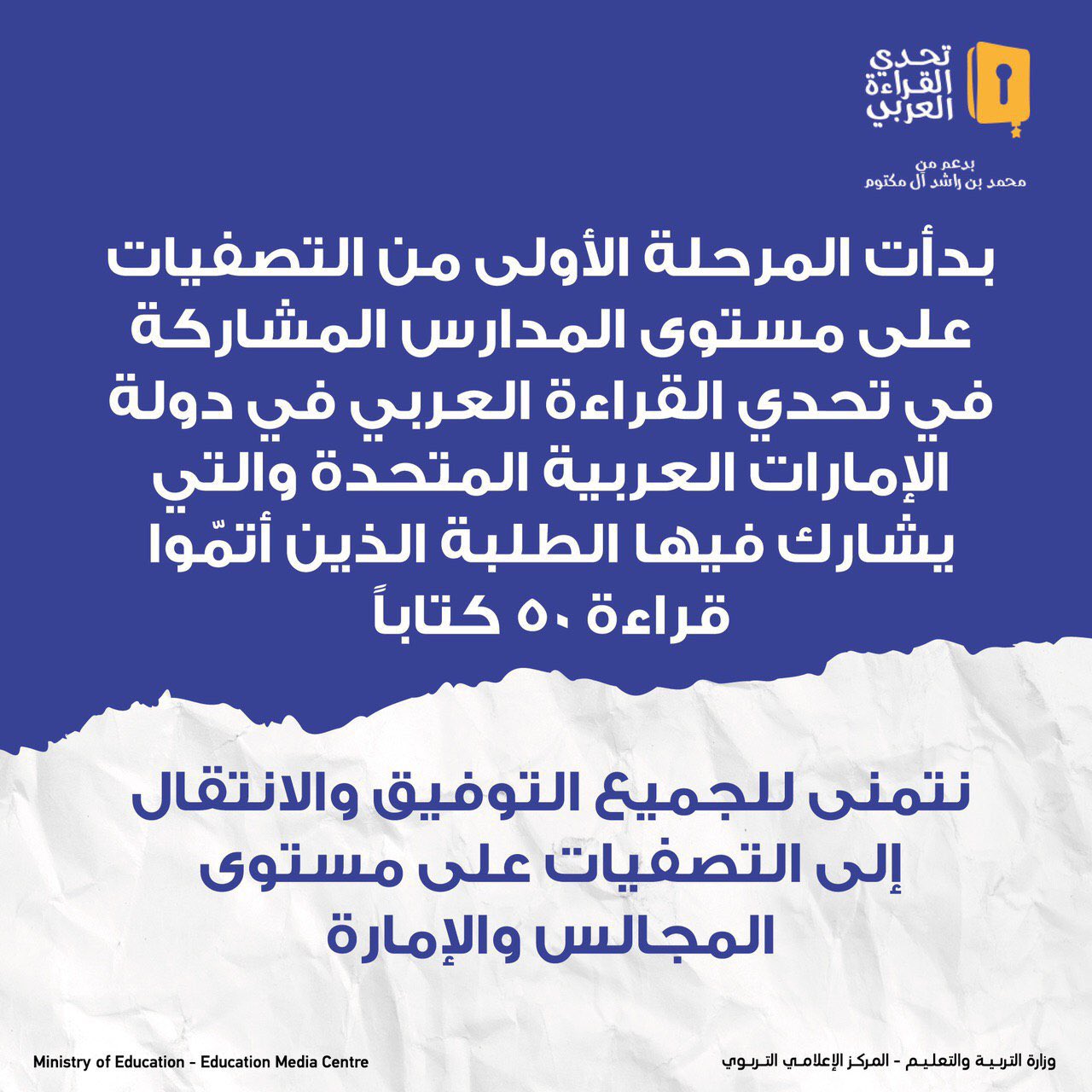 وزارة التربية على تويتر من منطلق تتويج جهود الطلبة المشاركين في مبادرة تحدي القراءة العربي في دولة الإمارات العربية المتحدة بدأت المرحلة الأولى من تصفيات الطلبة الذين أتموا قراءة 50 كتابا وتلخيص الكتاب المقروء