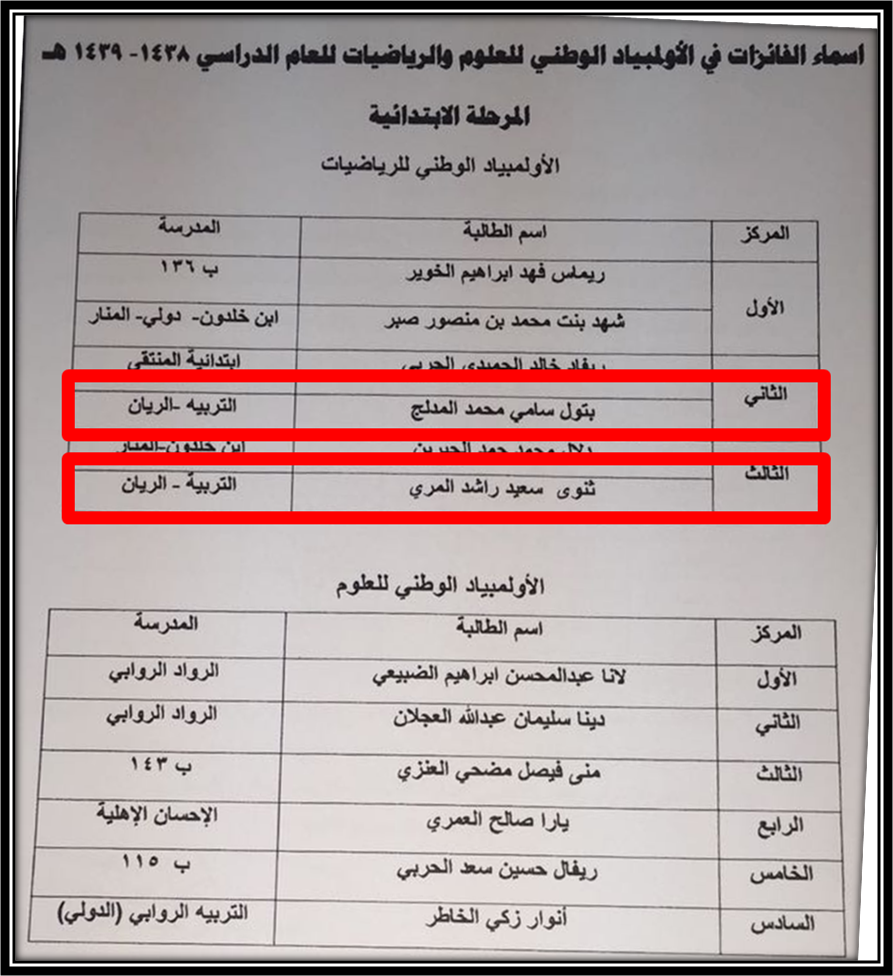 اخبار التربية النموذجية الابتدائية بنات الريان الطالبات الفائزات في أولمبياد الوطني للعلوم والرياضيات