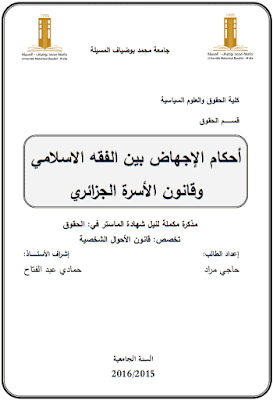 مذكرة ماستر أحكام الإجهاض بين الفقه الإسلامي وقانون الأسرة الجزائري Pdf