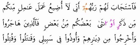 ف اس ت ج اب ل ه م ر ب ه م أ ن ي ل ا أ ض يع ع م ل ع ام ل م ن ك م م ن ذ ك ر أ و أ ن ث ى ب ع ض ك م م ن ب ع ض ف ال ذ ين ه اج ر وا و أ خ ر ج وا م ن د ي ار ه م و أ وذ وا ف ي س ب يل ي و ق ات ل وا و ق ت ل وا ل أ ك ف ر ن ع ن ه م