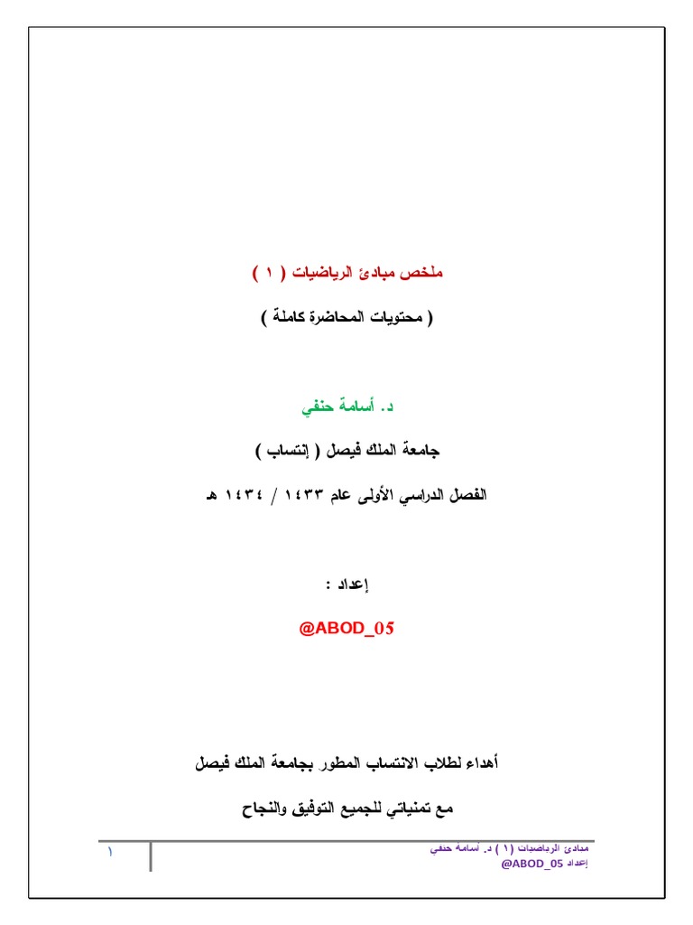 ملخص مبادئ رياضيات 1 المستوى الاول جديد كلية ادارة الاعمال جامعة الملك فيصل مناهج عربية