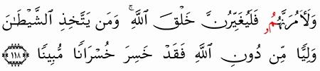 و لأ م ن ي ن ه م و لآم ر ن ه م ف ل ي ب ت ك ن آذ ان الأ ن ع ام و لآم ر ن ه م ف ل ي غ ي ر ن خ ل ق الل ه و م ن ي ت خ ذ الش ي ط ان و ل يا م ن.